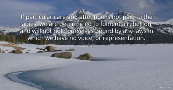 "If particular care and attention is not paid to the ladies, we are determined to foment a rebellion, and will not hold ourselves bound by any laws in which we have no voice, or representation." FixQuotes, 15 Jan. 2026, https://fixquotes.com/quotes/if-particular-care-and-attention-is-not-paid-to-19308/. Accessed 13 Feb. 2026.