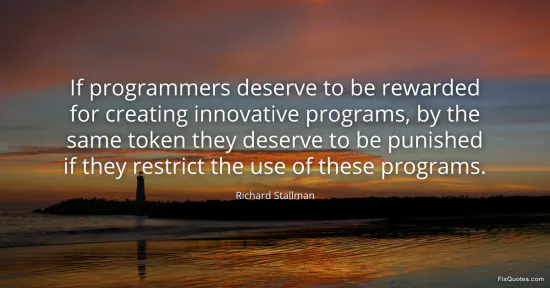 Stallman, Richard. "If programmers deserve to be rewarded for creating innovative programs, by the same token they deserve to be punished if they restrict the use of these programs." FixQuotes. January 16, 2026. https://fixquotes.com/quotes/if-programmers-deserve-to-be-rewarded-for-107536/.