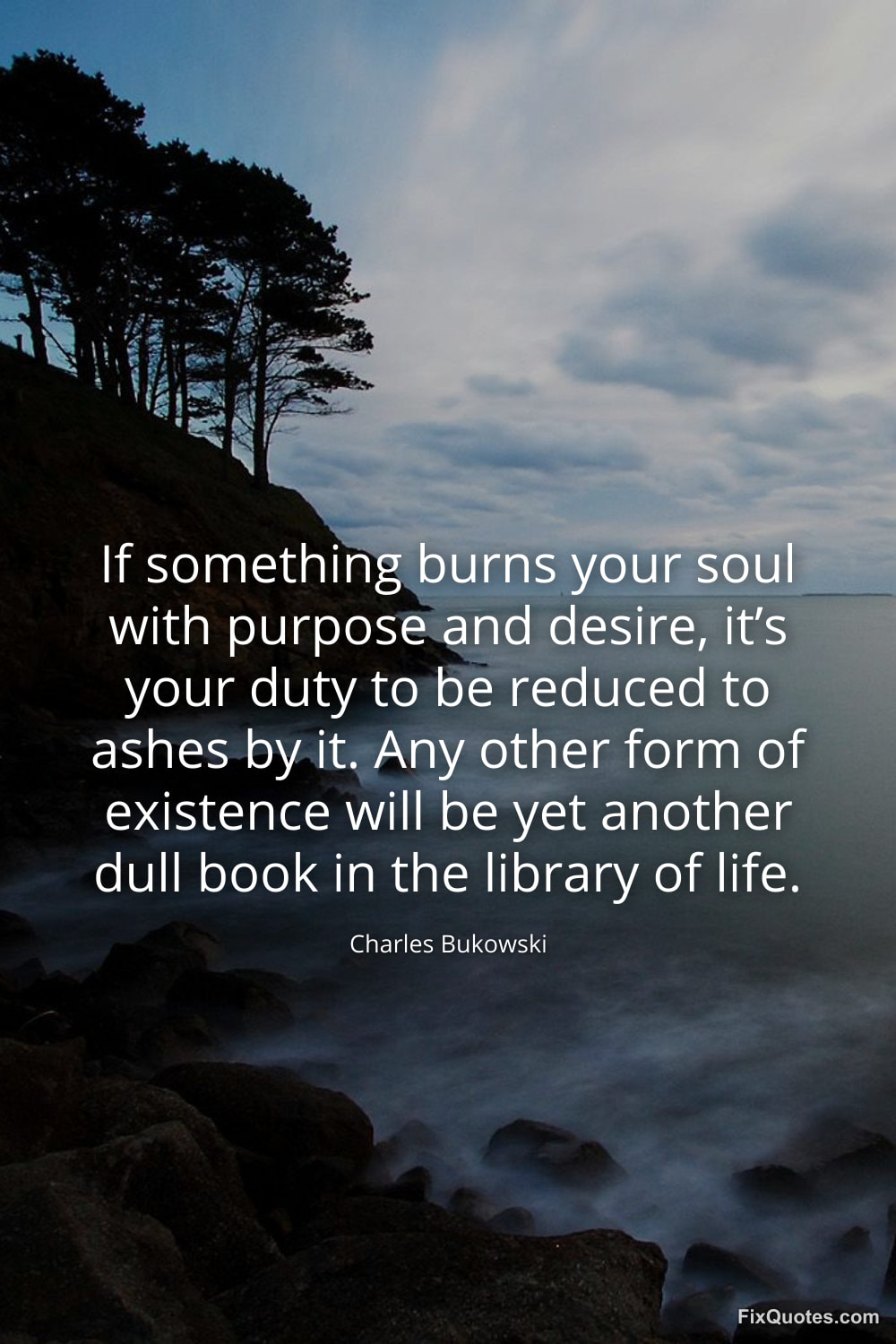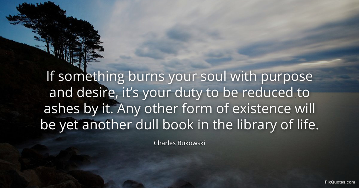 Bukowski, Charles. "If something burns your soul with purpose and desire, it’s your duty to be reduced to ashes by it. Any other form of existence will be yet another dull book in the library of life." FixQuotes. February 10, 2026. https://fixquotes.com/quotes/if-something-burns-your-soul-with-purpose-and-185115/.