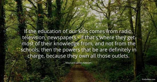 Keenan, Maynard James. "If the education of our kids comes from radio, television, newspapers - if that's where they get most of their knowledge from, and not from the schools, then the powers that be are definitely in charge, because they own all those outlets." FixQuotes. January 15, 2026. https://fixquotes.com/quotes/if-the-education-of-our-kids-comes-from-radio-153842/.