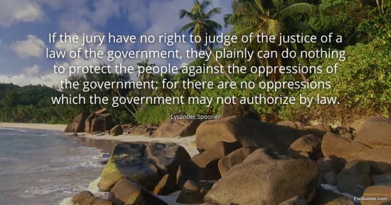 Spooner, Lysander. "If the jury have no right to judge of the justice of a law of the government, they plainly can do nothing to protect the people against the oppressions of the government; for there are no oppressions which the government may not authorize by law." FixQuotes. January 16, 2026. https://fixquotes.com/quotes/if-the-jury-have-no-right-to-judge-of-the-justice-88439/.