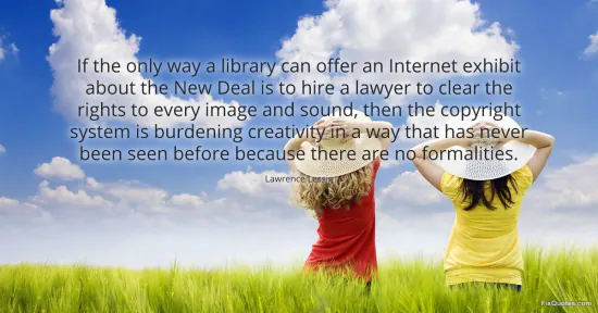 Lessig, Lawrence. "If the only way a library can offer an Internet exhibit about the New Deal is to hire a lawyer to clear the rights to every image and sound, then the copyright system is burdening creativity in a way that has never been seen before because there are no formalities." FixQuotes. January 16, 2026. https://fixquotes.com/quotes/if-the-only-way-a-library-can-offer-an-internet-113994/.