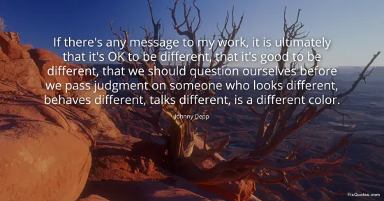 Depp, Johnny. "If there's any message to my work, it is ultimately that it's OK to be different, that it's good to be different, that we should question ourselves before we pass judgment on someone who looks different, behaves different, talks different, is a different color." FixQuotes. January 18, 2026. https://fixquotes.com/quotes/if-theres-any-message-to-my-work-it-is-ultimately-14742/.