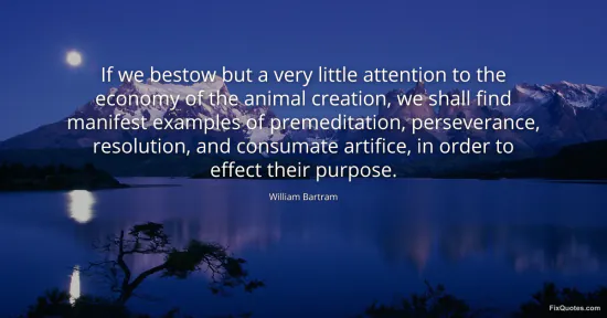 Bartram, William. (2026, January 18). If we bestow but a very little attention to the economy of the animal creation, we shall find manifest examples of premeditation, perseverance, resolution, and consumate artifice, in order to effect their purpose. FixQuotes. https://fixquotes.com/quotes/if-we-bestow-but-a-very-little-attention-to-the-8248/