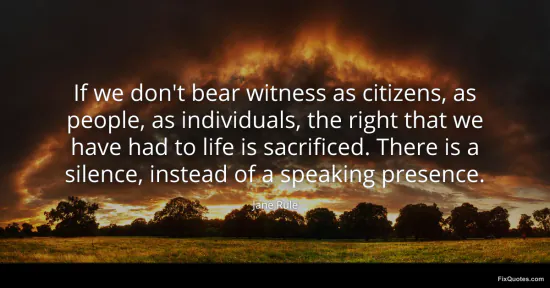 Rule, Jane. "If we don't bear witness as citizens, as people, as individuals, the right that we have had to life is sacrificed. There is a silence, instead of a speaking presence." FixQuotes. January 16, 2026. https://fixquotes.com/quotes/if-we-dont-bear-witness-as-citizens-as-people-as-112761/.