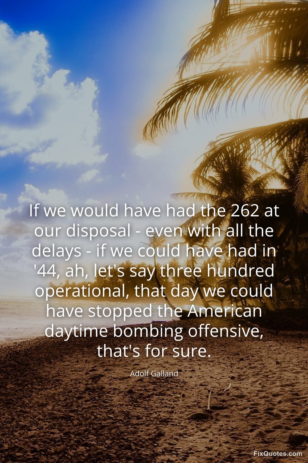 Galland, Adolf. (2026, January 15). If we would have had the 262 at our disposal - even with all the delays - if we could have had in '44, ah, let's say three hundred operational, that day we could have stopped the American daytime bombing offensive, that's for sure. FixQuotes. https://fixquotes.com/quotes/if-we-would-have-had-the-262-at-our-disposal-138240/