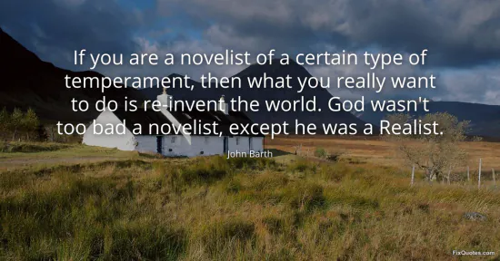 Barth, John. "If you are a novelist of a certain type of temperament, then what you really want to do is re-invent the world. God wasn't too bad a novelist, except he was a Realist." FixQuotes. January 16, 2026. https://fixquotes.com/quotes/if-you-are-a-novelist-of-a-certain-type-of-126290/.