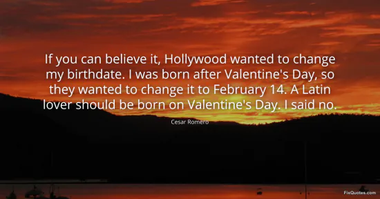 Romero, Cesar. "If you can believe it, Hollywood wanted to change my birthdate. I was born after Valentine's Day, so they wanted to change it to February 14. A Latin lover should be born on Valentine's Day. I said no." FixQuotes. January 17, 2026. https://fixquotes.com/quotes/if-you-can-believe-it-hollywood-wanted-to-change-49639/.