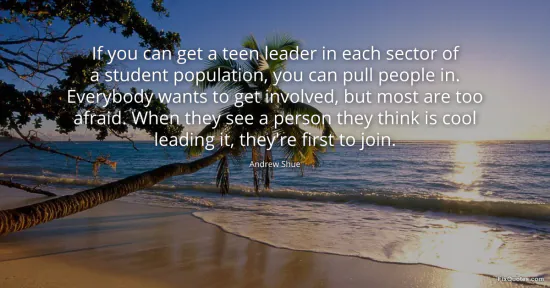 Shue, Andrew. (2026, January 17). If you can get a teen leader in each sector of a student population, you can pull people in. Everybody wants to get involved, but most are too afraid. When they see a person they think is cool leading it, they're first to join. FixQuotes. https://fixquotes.com/quotes/if-you-can-get-a-teen-leader-in-each-sector-of-a-74560/