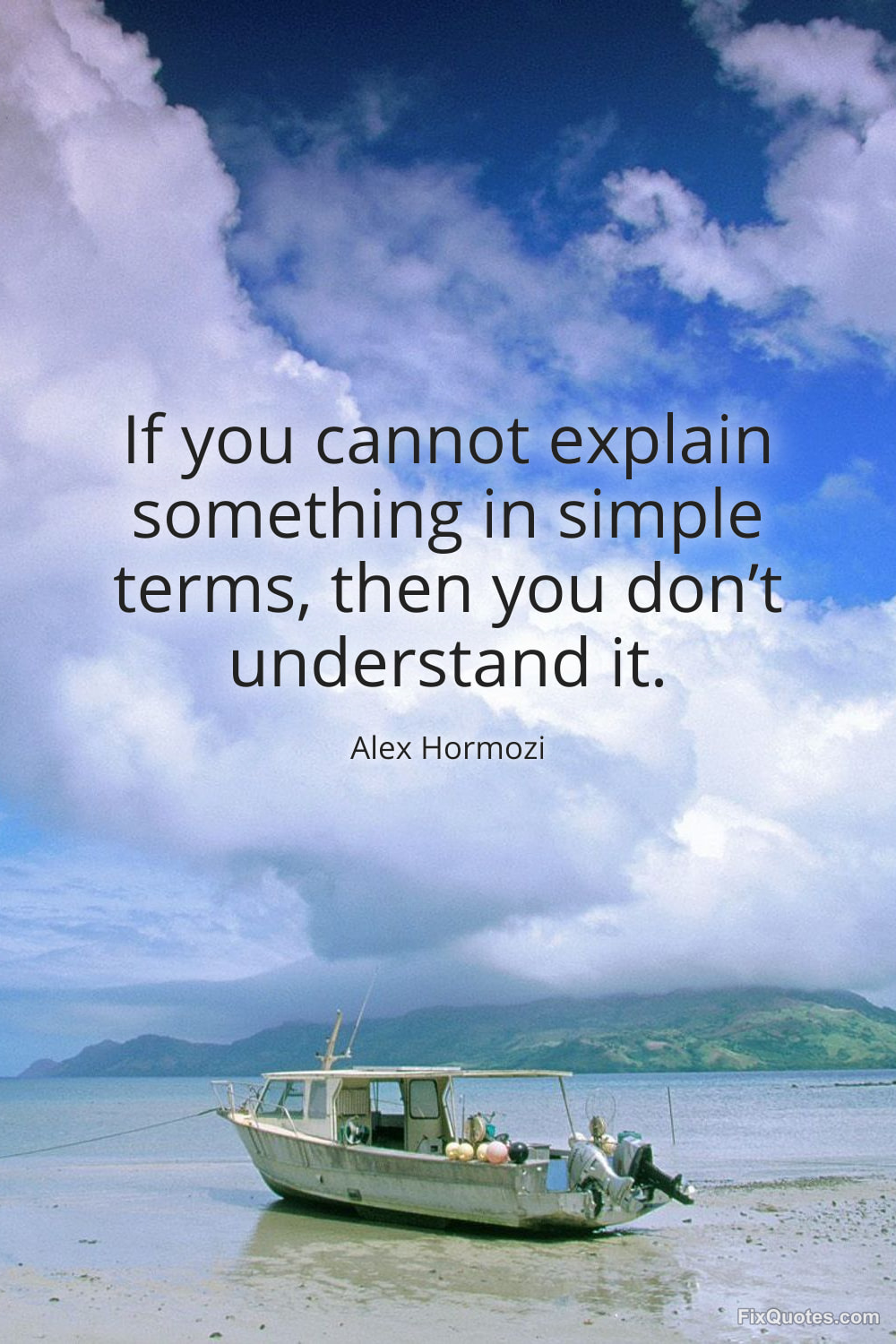 Hormozi, Alex. "If you cannot explain something in simple terms, then you don’t understand it." FixQuotes. January 13, 2026. https://fixquotes.com/quotes/if-you-cannot-explain-something-in-simple-terms-184007/.