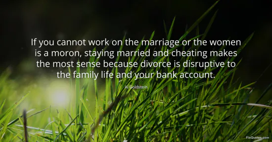 Goldstein, Al. "If you cannot work on the marriage or the women is a moron, staying married and cheating makes the most sense because divorce is disruptive to the family life and your bank account." FixQuotes. January 18, 2026. https://fixquotes.com/quotes/if-you-cannot-work-on-the-marriage-or-the-women-8945/.