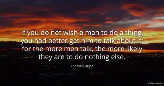 Carlyle, Thomas. "If you do not wish a man to do a thing, you had better get him to talk about it; for the more men talk, the more likely they are to do nothing else." FixQuotes. January 15, 2026. https://fixquotes.com/quotes/if-you-do-not-wish-a-man-to-do-a-thing-you-had-34565/.