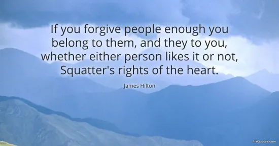 Hilton, James. "If you forgive people enough you belong to them, and they to you, whether either person likes it or not, Squatter's rights of the heart." FixQuotes. February 16, 2026. https://fixquotes.com/quotes/if-you-forgive-people-enough-you-belong-to-them-73817/.