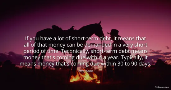 Sachs, Jeffrey. "If you have a lot of short-term debt, it means that all of that money can be demanded in a very short period of time. Technically, short-term debt means money that's coming due within a year. Typically, it means money that's coming due within 30 to 90 days." FixQuotes. January 18, 2026. https://fixquotes.com/quotes/if-you-have-a-lot-of-short-term-debt-it-means-20513/.