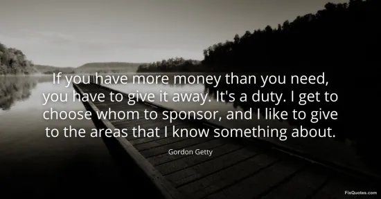 Getty, Gordon. "If you have more money than you need, you have to give it away. It's a duty. I get to choose whom to sponsor, and I like to give to the areas that I know something about." FixQuotes. January 15, 2026. https://fixquotes.com/quotes/if-you-have-more-money-than-you-need-you-have-to-154489/.