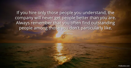 Honda, Soichiro. (2026, January 15). If you hire only those people you understand, the company will never get people better than you are. Always remember that you often find outstanding people among those you don't particularly like. FixQuotes. https://fixquotes.com/quotes/if-you-hire-only-those-people-you-understand-the-110405/