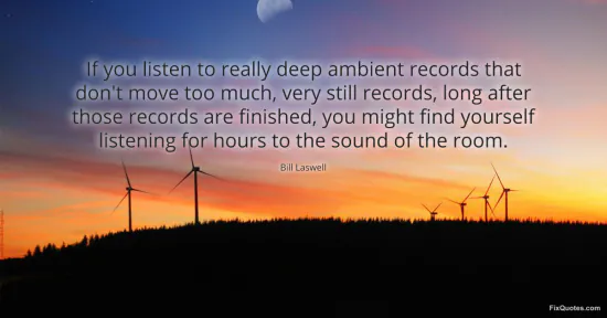 Laswell, Bill. "If you listen to really deep ambient records that don't move too much, very still records, long after those records are finished, you might find yourself listening for hours to the sound of the room." FixQuotes. January 17, 2026. https://fixquotes.com/quotes/if-you-listen-to-really-deep-ambient-records-that-48833/.