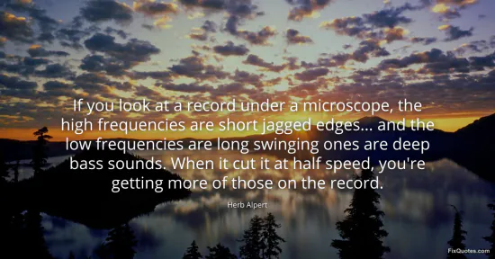 Alpert, Herb. (2026, January 16). If you look at a record under a microscope, the high frequencies are short jagged edges... and the low frequencies are long swinging ones are deep bass sounds. When it cut it at half speed, you're getting more of those on the record. FixQuotes. https://fixquotes.com/quotes/if-you-look-at-a-record-under-a-microscope-the-112575/