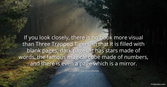 Infante, Guillermo Cabrera. "If you look closely, there is no book more visual than Three Trapped Tigers, in that it is filled with blank pages, dark pages, it has stars made of words, the famous magical cube made of numbers, and there is even a page which is a mirror." FixQuotes. January 15, 2026. https://fixquotes.com/quotes/if-you-look-closely-there-is-no-book-more-visual-144068/.