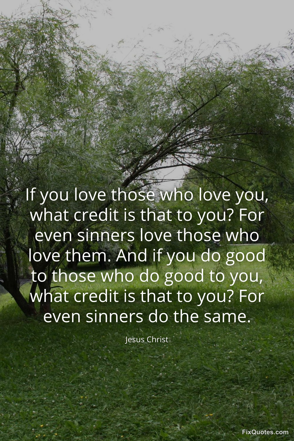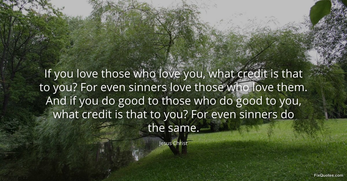 Christ, Jesus. "If you love those who love you, what credit is that to you? For even sinners love those who love them. And if you do good to those who do good to you, what credit is that to you? For even sinners do the same." FixQuotes. February 18, 2026. https://fixquotes.com/quotes/if-you-love-those-who-love-you-what-credit-is-185628/.