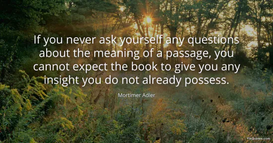 Adler, Mortimer. "If you never ask yourself any questions about the meaning of a passage, you cannot expect the book to give you any insight you do not already possess." FixQuotes. January 18, 2026. https://fixquotes.com/quotes/if-you-never-ask-yourself-any-questions-about-the-102/.