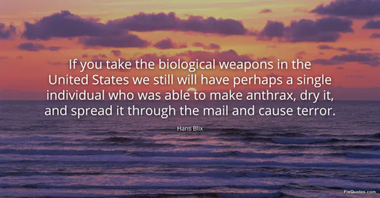 Blix, Hans. (2026, January 17). If you take the biological weapons in the United States we still will have perhaps a single individual who was able to make anthrax, dry it, and spread it through the mail and cause terror. FixQuotes. https://fixquotes.com/quotes/if-you-take-the-biological-weapons-in-the-united-71491/