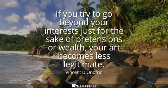 D'Onofrio is poking at a very modern disease: the impulse to treat creativity like a lifestyle brand that must constantly expand, monetize, and impress. His line draws a bright boundary between growth that comes from genuine curiosity and growth that comes from “pretensions or wealth” - the urge to look serious, look elevated, or look profitable. The bluntest word here is “legitimate,” because he’s not just arguing about quality; he’s arguing about authority. Art earns its right to exist, in his view, by being tethered to a real internal appetite.