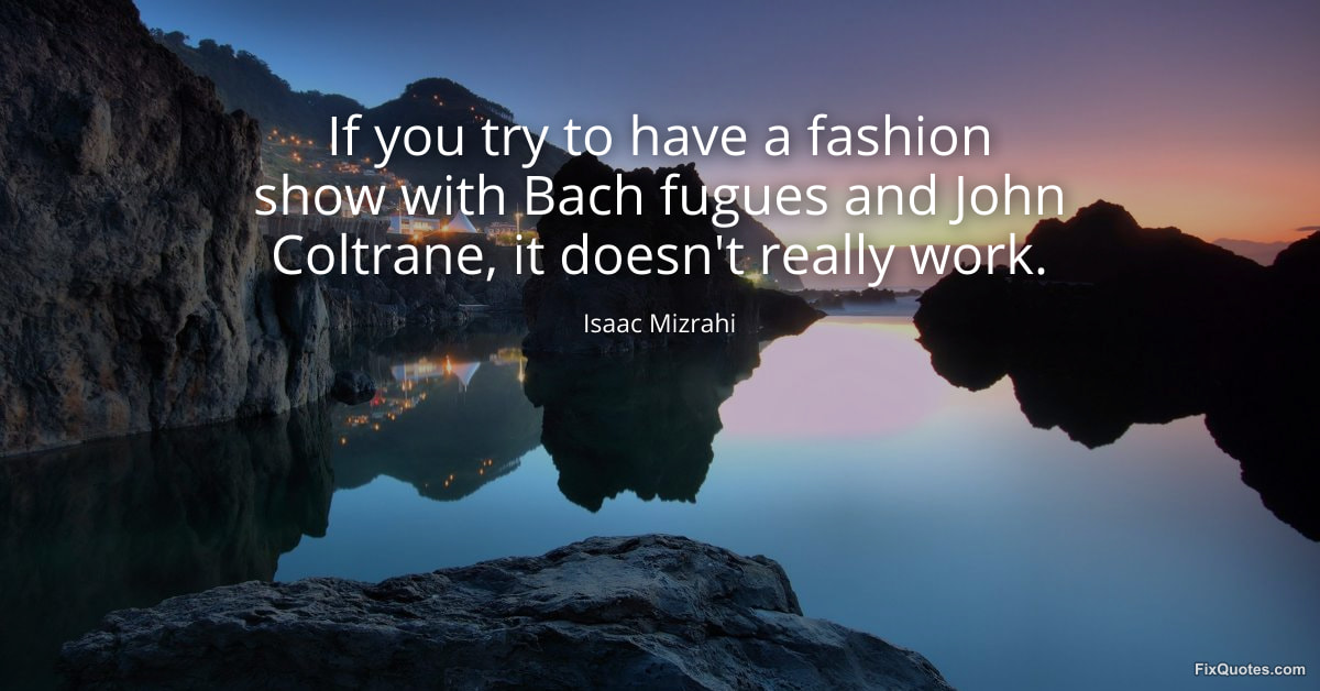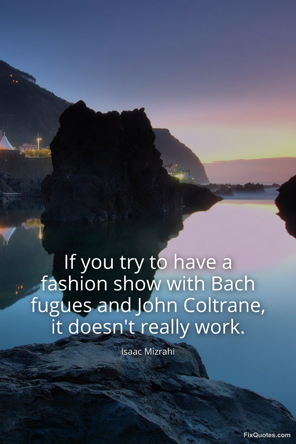 Mizrahi, Isaac. (2026, January 17). If you try to have a fashion show with Bach fugues and John Coltrane, it doesn't really work. FixQuotes. https://fixquotes.com/quotes/if-you-try-to-have-a-fashion-show-with-bach-24389/