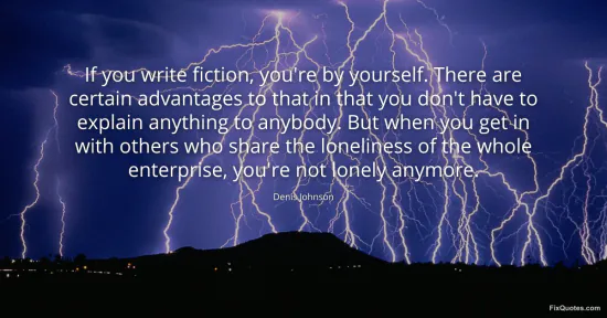 Johnson, Denis. (2026, January 15). If you write fiction, you're by yourself. There are certain advantages to that in that you don't have to explain anything to anybody. But when you get in with others who share the loneliness of the whole enterprise, you're not lonely anymore. FixQuotes. https://fixquotes.com/quotes/if-you-write-fiction-youre-by-yourself-there-are-3950/