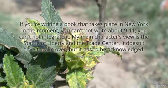 Price, Richard. (2026, January 17). If you're writing a book that takes place in New York in the moment, you can't not write about 9-11; you can't not integrate it. My main character's view is the Statue of Liberty and the Trade Center. It doesn't have to take over, but it has to be acknowledged. FixQuotes. https://fixquotes.com/quotes/if-youre-writing-a-book-that-takes-place-in-new-65119/