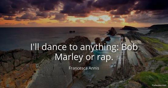 Annis, Francesca. "I'll dance to anything: Bob Marley or rap." FixQuotes. January 18, 2026. https://fixquotes.com/quotes/ill-dance-to-anything-bob-marley-or-rap-12533/.