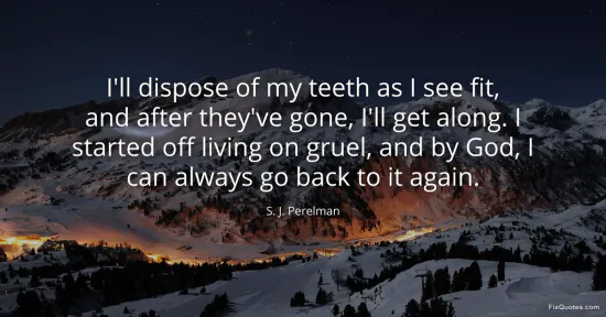 Perelman, S. J. (2026, January 16). I'll dispose of my teeth as I see fit, and after they've gone, I'll get along. I started off living on gruel, and by God, I can always go back to it again. FixQuotes. https://fixquotes.com/quotes/ill-dispose-of-my-teeth-as-i-see-fit-and-after-133502/
