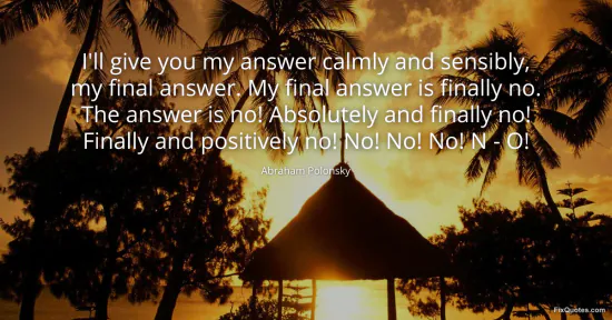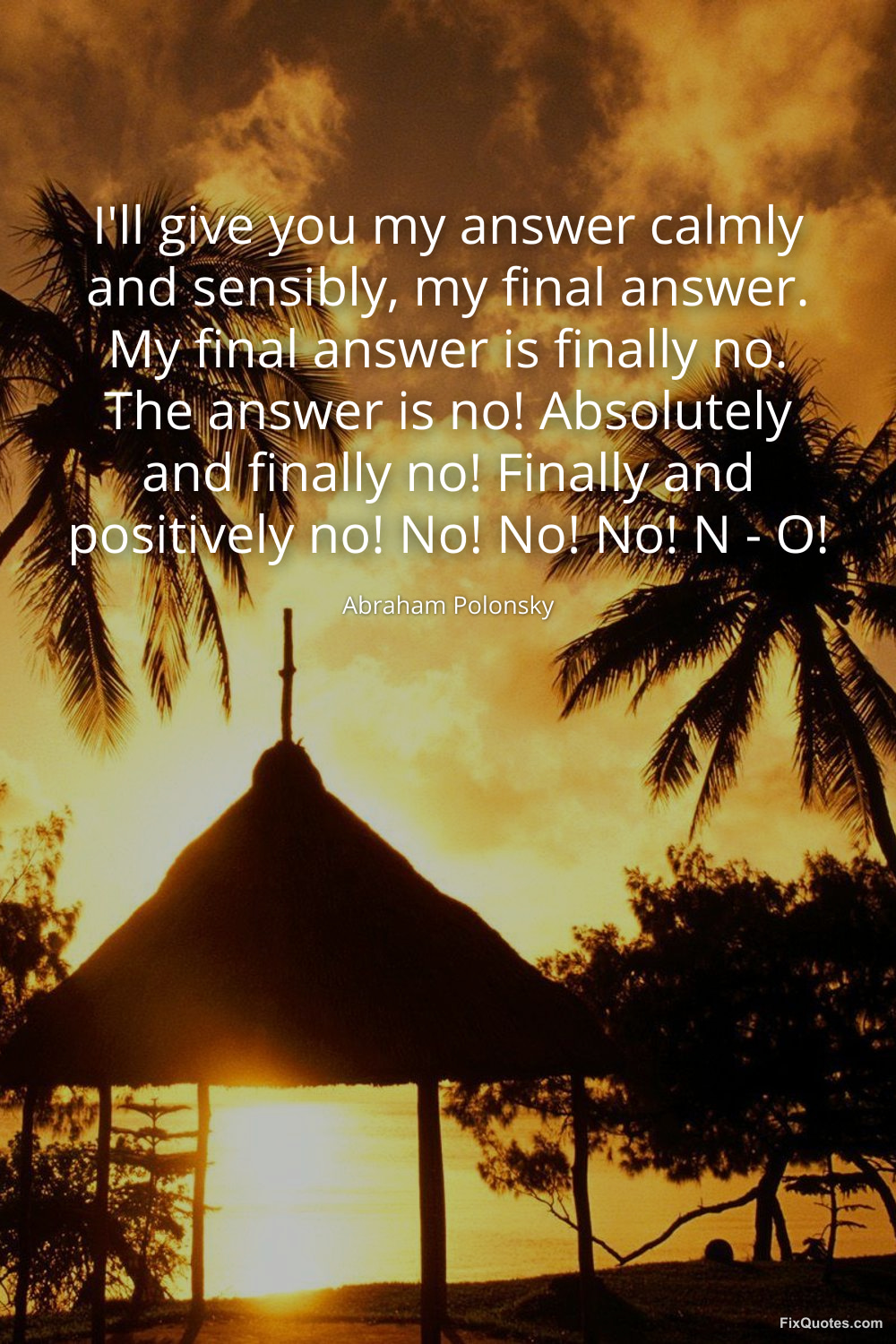 Polonsky, Abraham. (2026, January 16). I'll give you my answer calmly and sensibly, my final answer. My final answer is finally no. The answer is no! Absolutely and finally no! Finally and positively no! No! No! No! N - O! FixQuotes. https://fixquotes.com/quotes/ill-give-you-my-answer-calmly-and-sensibly-my-111603/
