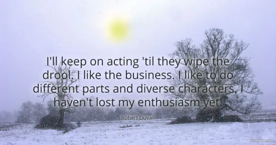 Duvall, Robert. "I'll keep on acting 'til they wipe the drool. I like the business. I like to do different parts and diverse characters. I haven't lost my enthusiasm yet!" FixQuotes. January 16, 2026. https://fixquotes.com/quotes/ill-keep-on-acting-til-they-wipe-the-drool-i-like-115707/.