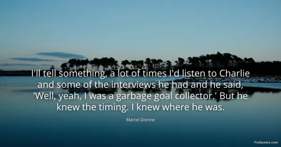 Dionne, Marcel. "I'll tell something, a lot of times I'd listen to Charlie and some of the interviews he had and he said, 'Well, yeah, I was a garbage goal collector.' But he knew the timing. I knew where he was." FixQuotes. January 16, 2026. https://fixquotes.com/quotes/ill-tell-something-a-lot-of-times-id-listen-to-104047/.