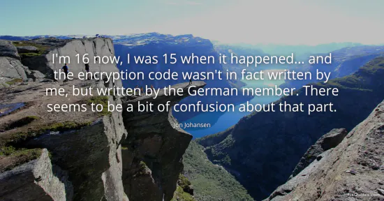 Johansen, Jon. "I'm 16 now, I was 15 when it happened... and the encryption code wasn't in fact written by me, but written by the German member. There seems to be a bit of confusion about that part." FixQuotes. January 17, 2026. https://fixquotes.com/quotes/im-16-now-i-was-15-when-it-happened-and-the-32814/.