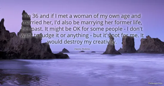 Rollins, Henry. (2026, January 18). I'm 36 and if I met a woman of my own age and married her, I'd also be marrying her former life, her past. It might be OK for some people - I don't want to judge it or anything - but it's not for me. It would destroy my creativity. FixQuotes. https://fixquotes.com/quotes/im-36-and-if-i-met-a-woman-of-my-own-age-and-19941/
