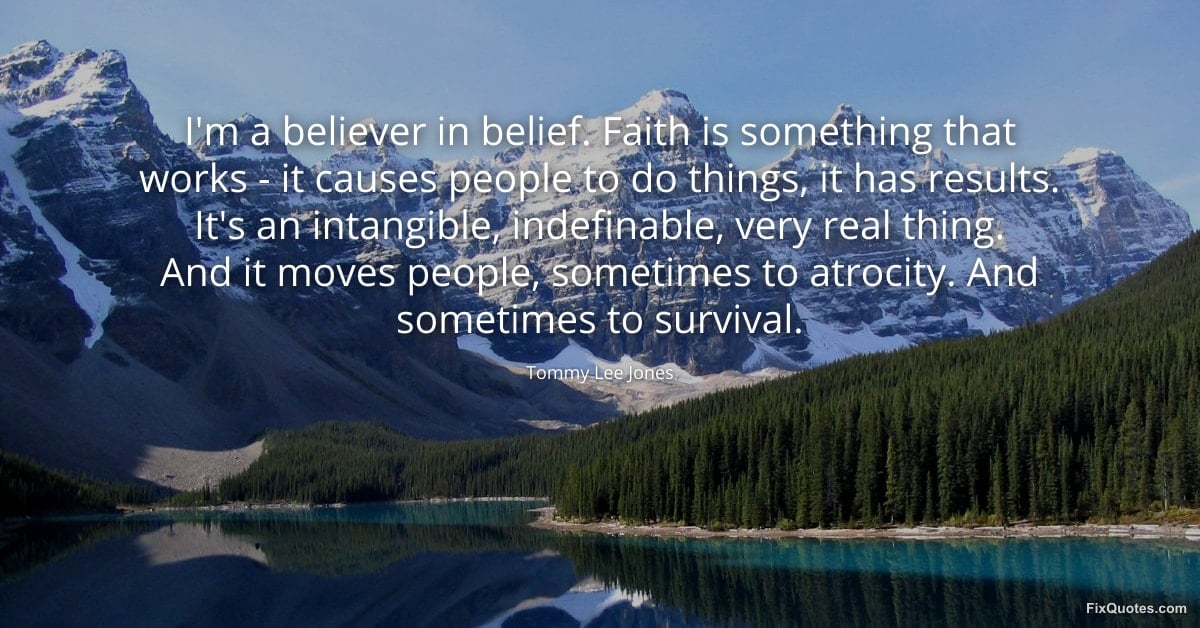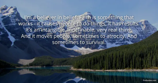 Jones, Tommy Lee. "I'm a believer in belief. Faith is something that works - it causes people to do things, it has results. It's an intangible, indefinable, very real thing. And it moves people, sometimes to atrocity. And sometimes to survival." FixQuotes. January 11, 2026. https://fixquotes.com/quotes/im-a-believer-in-belief-faith-is-something-that-183740/.