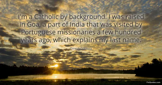 D'Souza, Dinesh. (2026, January 14). I'm a Catholic by background. I was raised in Goa, a part of India that was visited by Portuguese missionaries a few hundred years ago, which explains my last name. FixQuotes. https://fixquotes.com/quotes/im-a-catholic-by-background-i-was-raised-in-goa-a-147695/