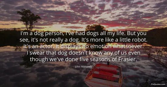 Mahoney, John. "I'm a dog person, I've had dogs all my life. But you see, it's not really a dog. It's more like a little robot. It's an actor. It displays no emotion whatsoever. I swear that dog doesn't know any of us even though we've done five seasons of Frasier." FixQuotes. January 14, 2026. https://fixquotes.com/quotes/im-a-dog-person-ive-had-dogs-all-my-life-but-you-148648/.