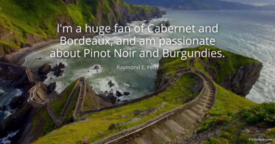 Feist, Raymond E. (2026, January 15). I'm a huge fan of Cabernet and Bordeaux, and am passionate about Pinot Noir and Burgundies. FixQuotes. https://fixquotes.com/quotes/im-a-huge-fan-of-cabernet-and-bordeaux-and-am-166508/