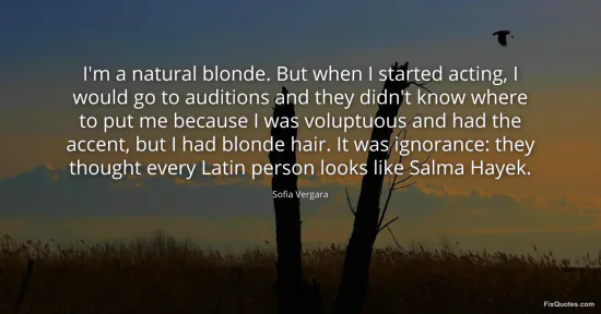 Vergara, Sofia. (2026, January 16). I'm a natural blonde. But when I started acting, I would go to auditions and they didn't know where to put me because I was voluptuous and had the accent, but I had blonde hair. It was ignorance: they thought every Latin person looks like Salma Hayek. FixQuotes. https://fixquotes.com/quotes/im-a-natural-blonde-but-when-i-started-acting-i-110403/