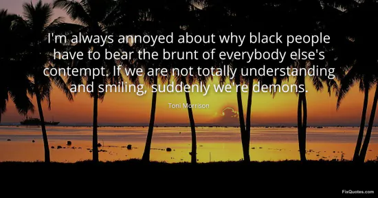 Morrison, Toni. (2026, January 16). I'm always annoyed about why black people have to bear the brunt of everybody else's contempt. If we are not totally understanding and smiling, suddenly we're demons. FixQuotes. https://fixquotes.com/quotes/im-always-annoyed-about-why-black-people-have-to-82597/