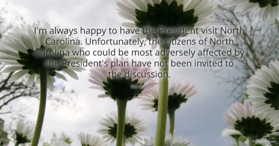 "I'm always happy to have the President visit North Carolina. Unfortunately, the citizens of North Carolina who could be most adversely affected by the President's plan have not been invited to the discussion." FixQuotes, 16 Jan. 2026, https://fixquotes.com/quotes/im-always-happy-to-have-the-president-visit-north-130022/. Accessed 25 Feb. 2026.
