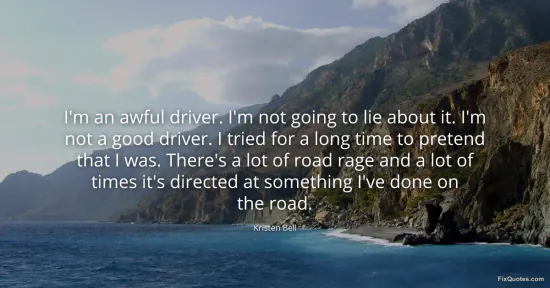 Bell, Kristen. "I'm an awful driver. I'm not going to lie about it. I'm not a good driver. I tried for a long time to pretend that I was. There's a lot of road rage and a lot of times it's directed at something I've done on the road." FixQuotes. January 17, 2026. https://fixquotes.com/quotes/im-an-awful-driver-im-not-going-to-lie-about-it-80967/.