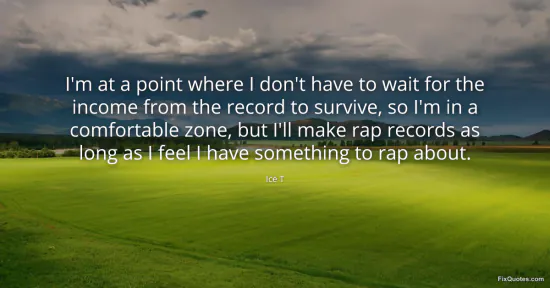 T, Ice. "I'm at a point where I don't have to wait for the income from the record to survive, so I'm in a comfortable zone, but I'll make rap records as long as I feel I have something to rap about." FixQuotes. January 17, 2026. https://fixquotes.com/quotes/im-at-a-point-where-i-dont-have-to-wait-for-the-61975/.