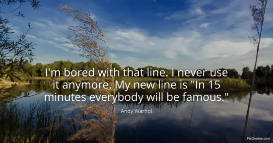 "I'm bored with that line. I never use it anymore. My new line is "In 15 minutes everybody will be famous."." FixQuotes, 18 Jan. 2026, https://fixquotes.com/quotes/im-bored-with-that-line-i-never-use-it-anymore-my-15245/. Accessed 12 Feb. 2026.