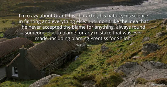 Foote, Shelby. "I'm crazy about Grant: his character, his nature, his science in fighting and everything else. But I don't like the idea that he never accepted the blame for anything, always found someone else to blame for any mistake that was ever made, including blaming Prentiss for Shiloh." FixQuotes. January 17, 2026. https://fixquotes.com/quotes/im-crazy-about-grant-his-character-his-nature-his-73751/.