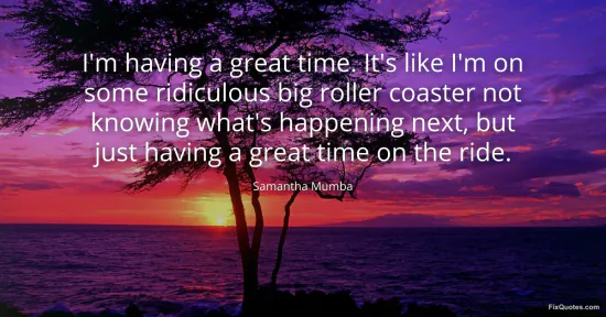 Mumba, Samantha. (2026, January 16). I'm having a great time. It's like I'm on some ridiculous big roller coaster not knowing what's happening next, but just having a great time on the ride. FixQuotes. https://fixquotes.com/quotes/im-having-a-great-time-its-like-im-on-some-102640/