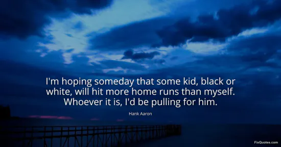 "I'm hoping someday that some kid, black or white, will hit more home runs than myself. Whoever it is, I'd be pulling for him." FixQuotes, 16 Jan. 2026, https://fixquotes.com/quotes/im-hoping-someday-that-some-kid-black-or-white-101432/. Accessed 27 Feb. 2026.